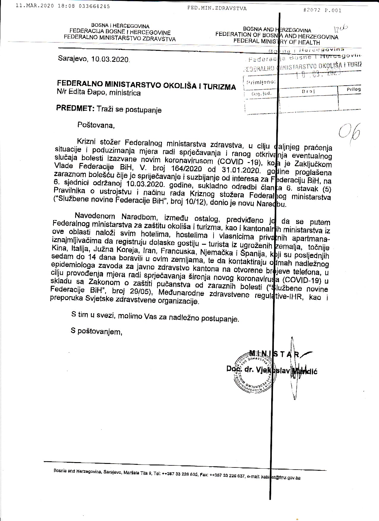 iz ugroženih zemalja, točnije Kine, Italije, Južne Koreje, Irana, Francuske, Njemačke i Španjolske, koji su posljednjih sedam do 14 dana boravili u ovim zemljama, te da kontaktiraju odmah nadležnog epidemiologa zavoda za javno zdravstvo kantona na otvorene brojeve telefona, u cilju provođenje mjera radi sprečavanja širenja novog koronavirusa (COVID 19) u skladu sa Zakonom o zaštiti stanovništva od zaraznih bolesti („Službene novine Federacije BiH“, broj 29/05) Međunarodne zdravstvene regulative – IHR, kao i preporuke Svjetske zdravstvene organizacije. U prilogu se nalaze obavijesti i naredba.