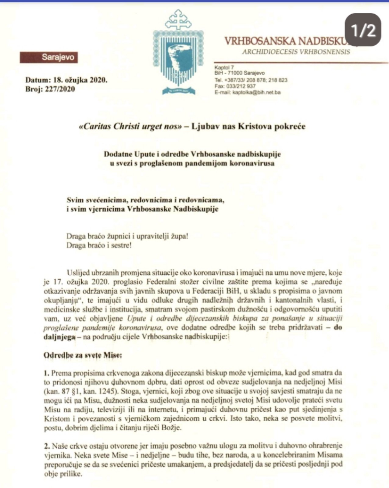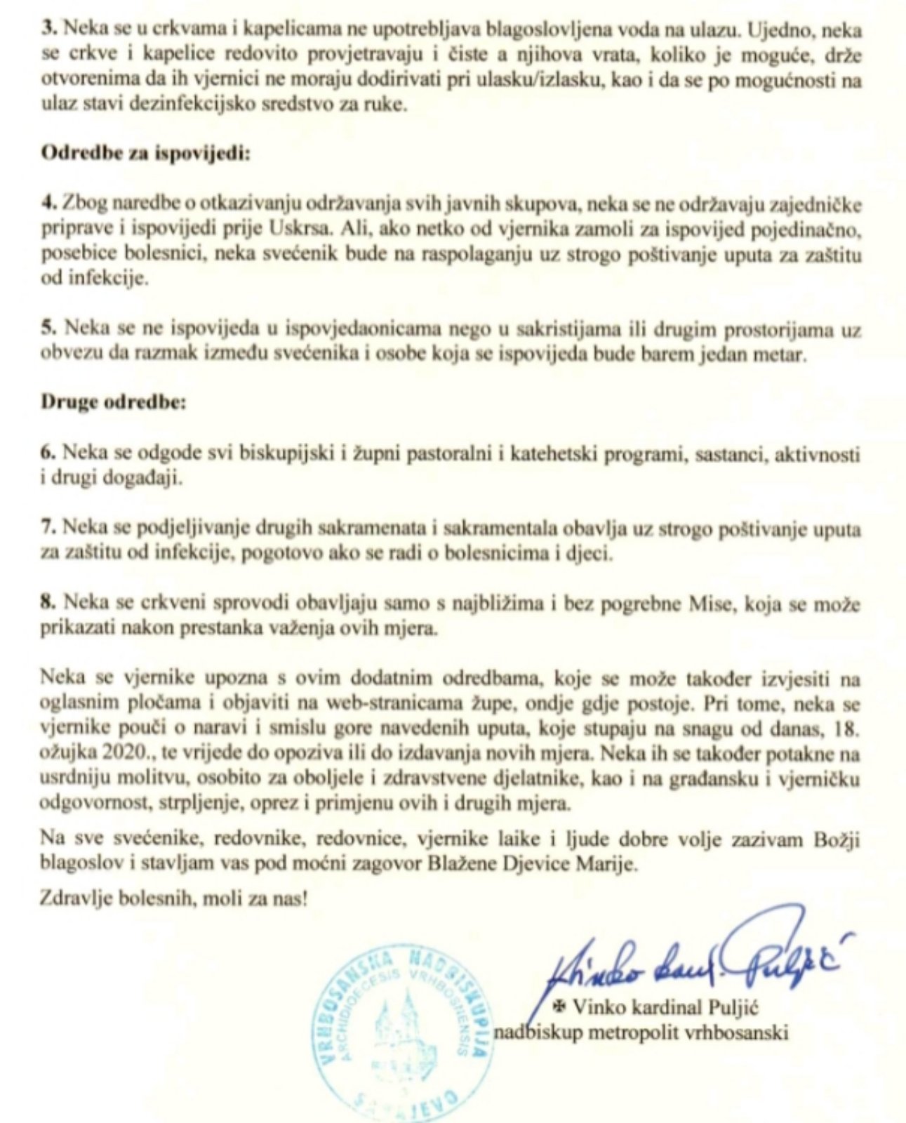 Uslijed ubrzanih promjena situacije oko koronavirusa i imajući na umu nove mjere, koje je 17. ožujka 2020. proglasio Federalni stožer civilne zaštite prema kojima se „naređuje otkazivanje održavanja svih javnih skupova u Federaciji BiH, u skladu s propisima o javnom okupljanju“, te imajući u vidu odluke drugih nadležnih državnih i kantonalnih vlasti, i medicinske službe i institucija, Vinko kardinal Puljić, nadbiskup metropolit vrhbosanski uputio je, uz već objavljene Upute i odredbe dijecezanskih biskupa za ponašanje u situaciji proglašene pandemije koronavirusa, dodatne odredbe kojih se treba pridržavati – do daljnjega – na području cijele Vrhbosanske nadbiskupije.
