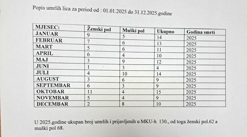 Matične knjige umrlih zabilježile su kako je u 2025. godini preminulo 130 naših sugrađana, 62 žene i 68 muškaraca. Najviše umrlih bilo je u mjesecu listopadu - 15 te u siječnju i srpnju – po 14. Najmanje smrtnih slučajeva zabilježeno je u mjesecu lipnju – 4.