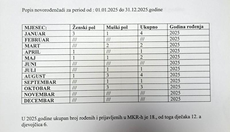 Po podacima tijekom 2025. godine rođeno je 6 djevojčica i 12 dječaka. Najviše rođenih beba bilo je u mjesecima siječnju i kolovozu – po 4. U mjesecima veljači, lipnju, studenom i prosincu nije bilo upisanih rođenih beba u matične knjige rođenih.