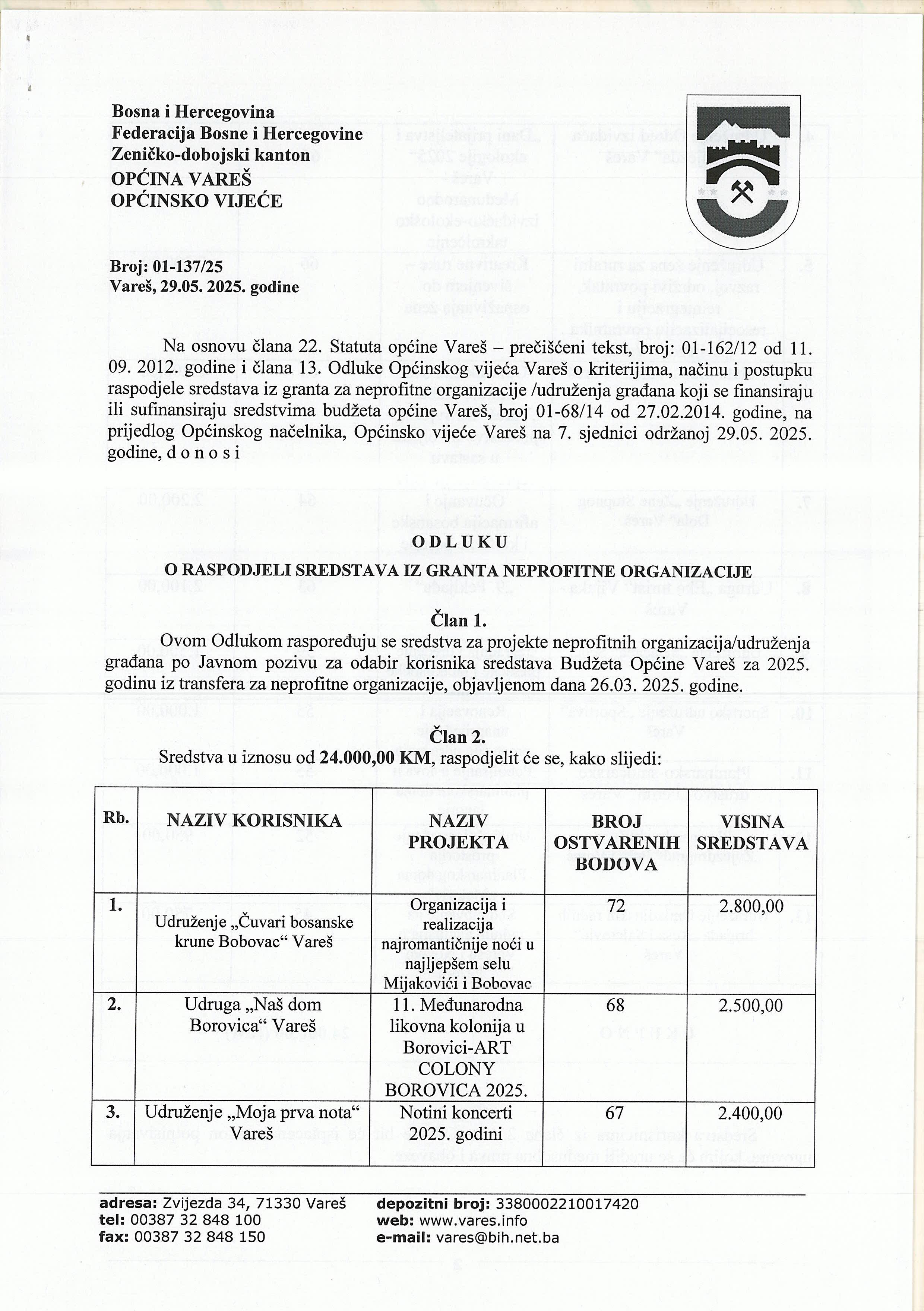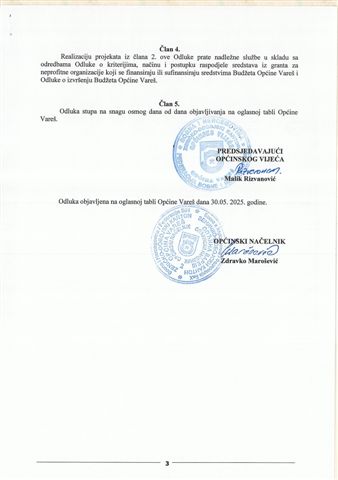 Grant za neprofitne organizacije i Grant za sudjelovanje u financiranju udruženja proisteklih iz rata, da će se potpisivanje Ugovora obaviti dana 11.06. 2025. godine (srijeda) u dvorani Općinskog vijeća Vareš u 10 sati.