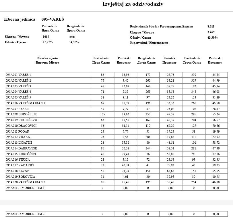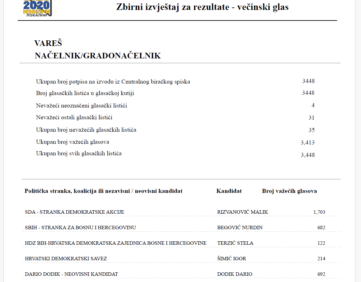 Prema podacima koji su pristigli u Općinsko izborno povjerenstvo sa redovnih biračkih mjesta za načelnika Vareša rezultati su sljedeći: