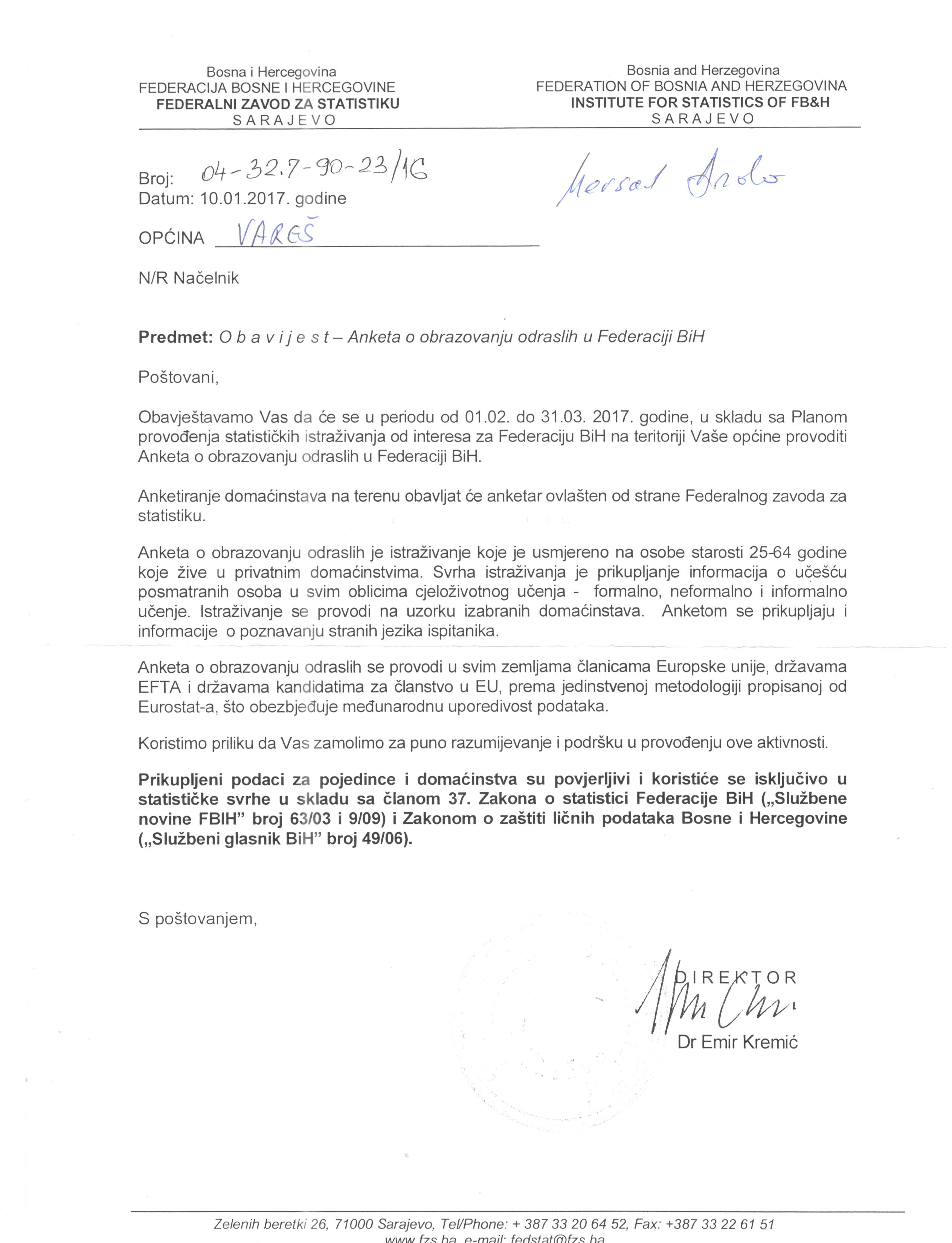 Obavještavamo Vas da će se u periodu od 01.02. do 31.03. 2017. godine, u skladu sa Planom provođenja statističkih istraživanja od interesa za Federaciju BiH na teritoriji Vaše općine provoditi Anketa o obrazovanju odraslih u Federaciji BiH.