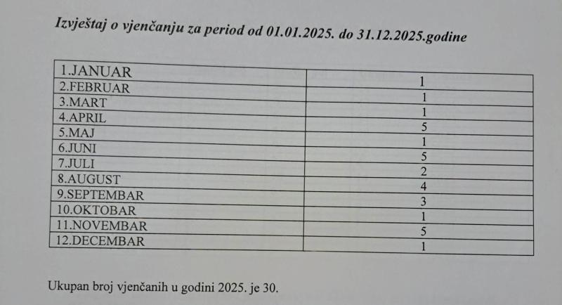 Najviše vjenčanih parova bilo je u mjesecima travnju, lipnju i studenom – po 5. Zanimljivo je da je u svim mjesecima 2025. godine zabilježeno bar po jedno vjenčanje.
